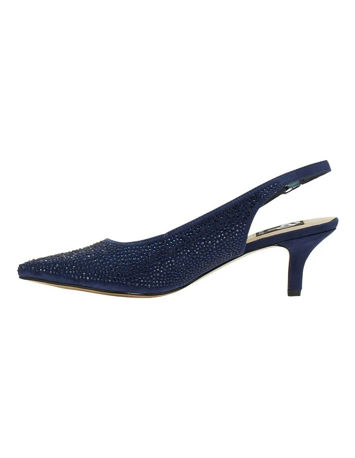 Dazzle on the dance floor with Teagan. This sleek kitten heel pump is adorned with embellishments, an adjustable sling back strap and on-trend pointed toe heel.
