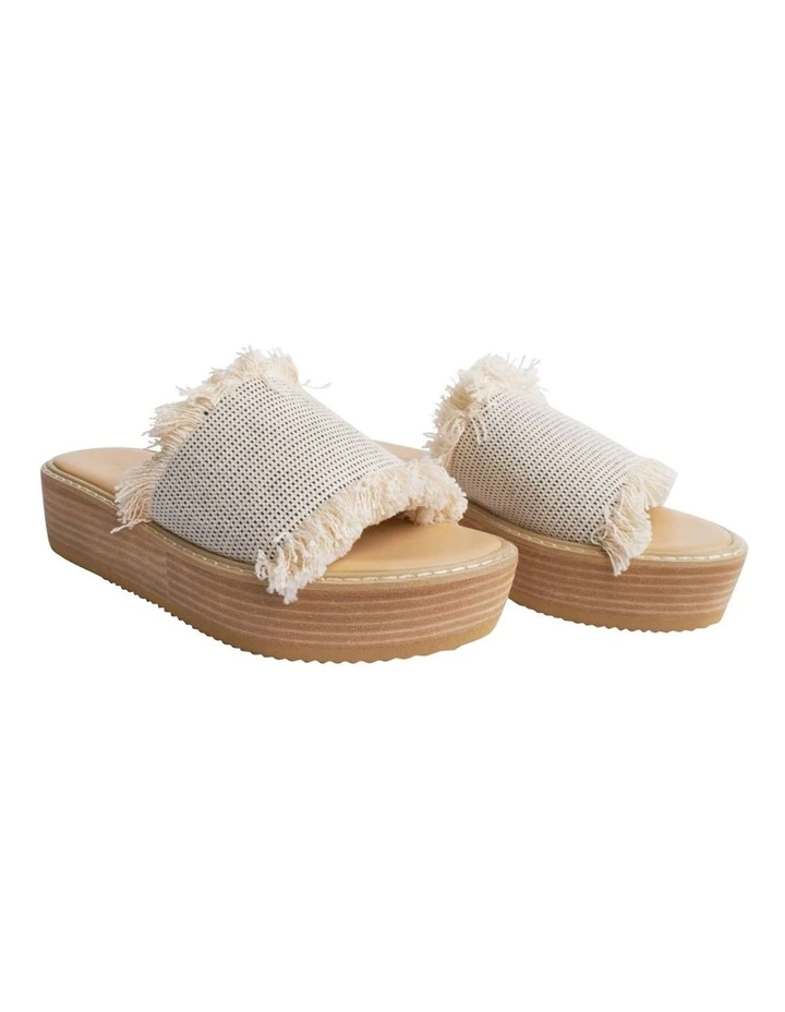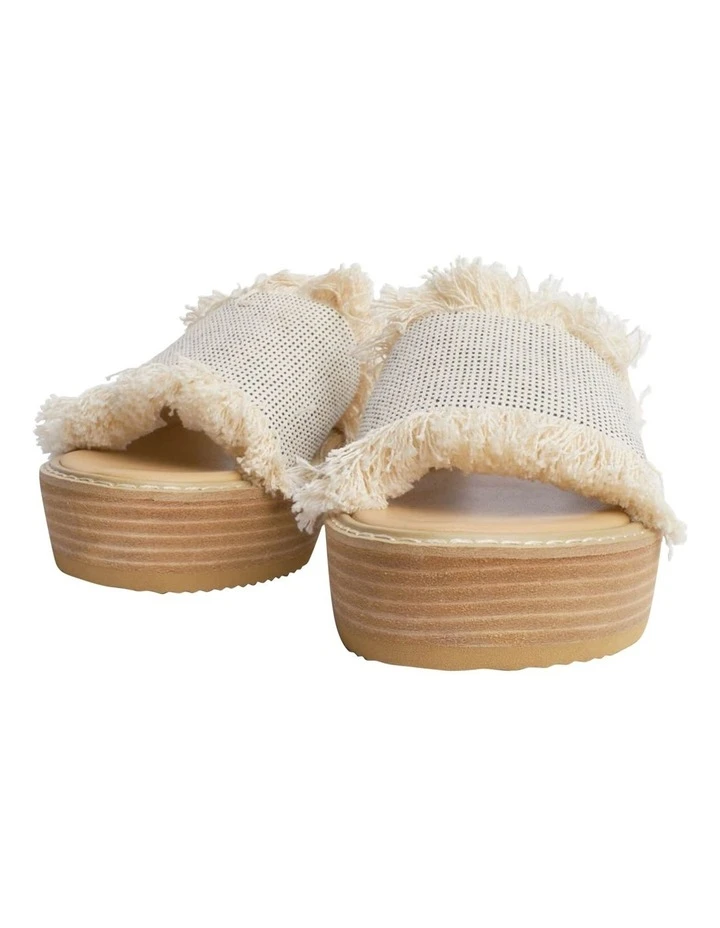 Slip into elevated comfort with the Ebony sandals. Showcasing a textured white and black cotton fringed upper with an open rounded toe and a platform sole.
