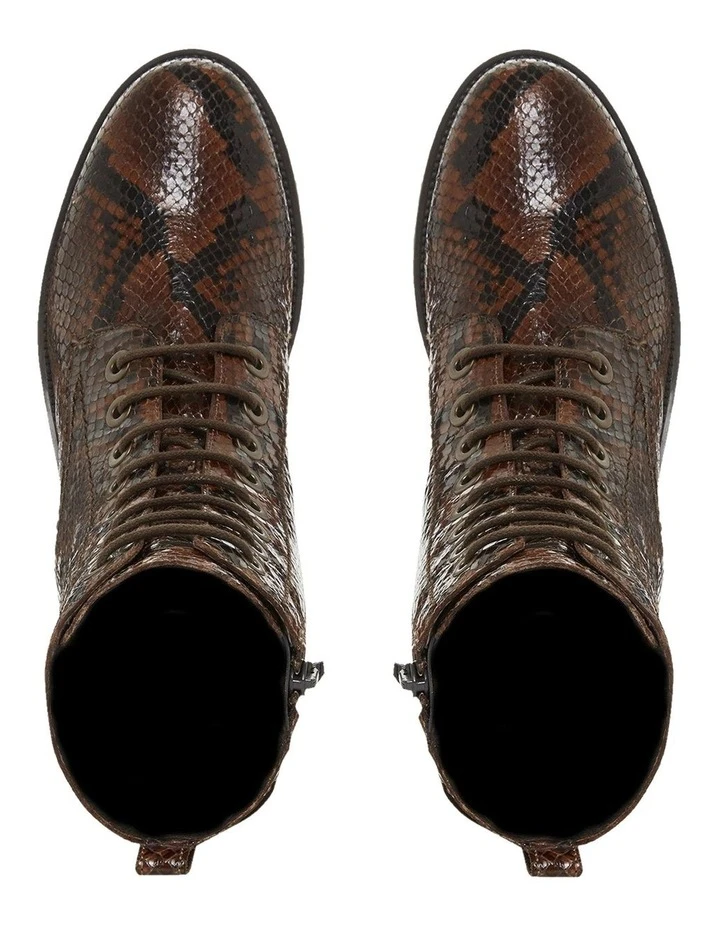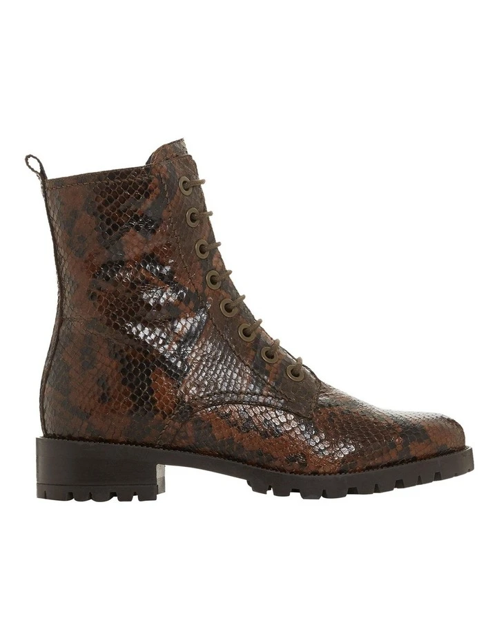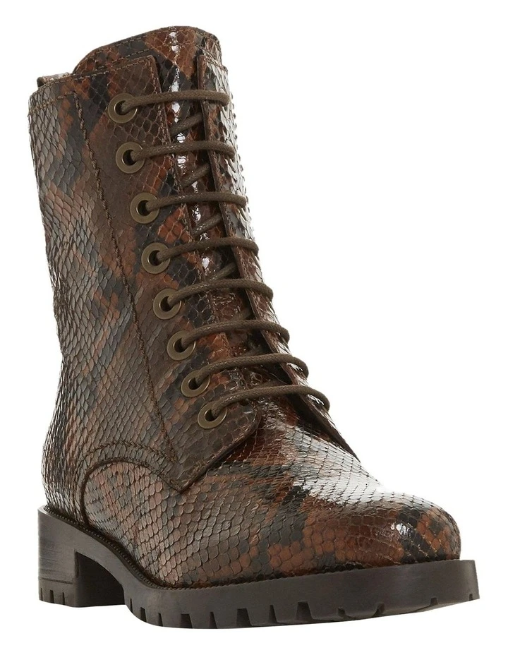 The Prestone boot from Dune will add edge to your footwear line-up. Resting on a comfortable low block heel and shaped with a round toe. It’s fitted with a pull tab and secured with a stylish lace-up fastening.