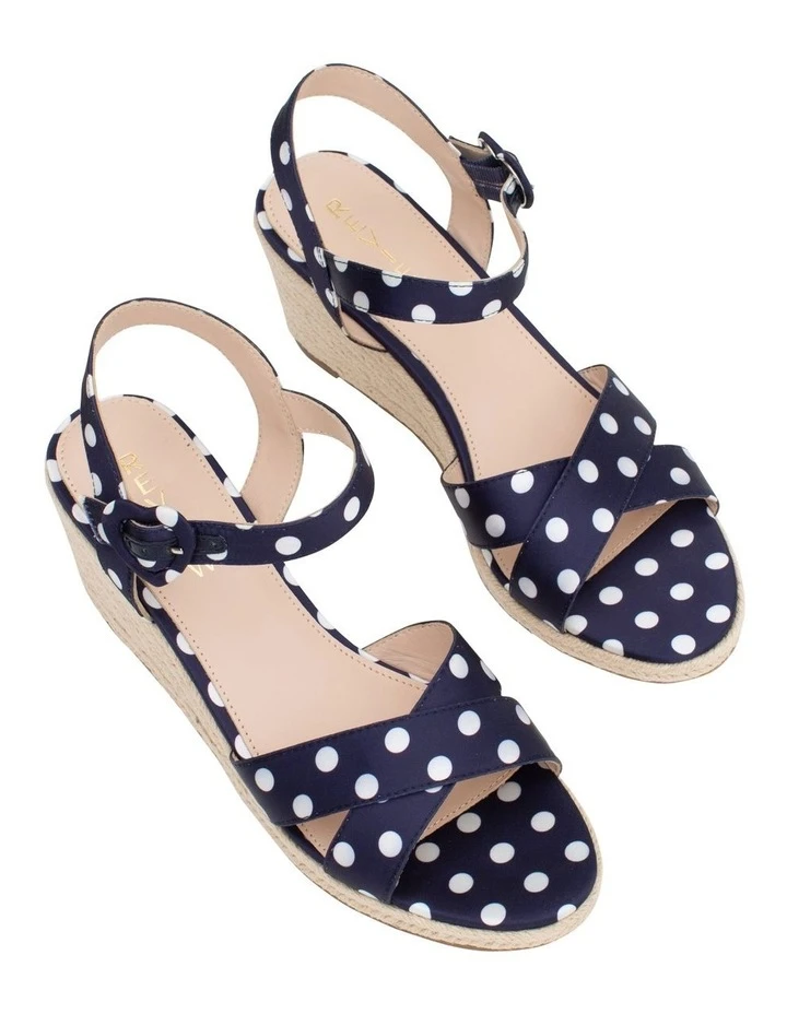 The Joan Espadrille and stylish and comfy all in one! It features a navy satin fabrication with an ivory spot. It has a cross over strap and a adjustable ankle strap. It features our classic heart buckle closure and a comfortable wedge heel.