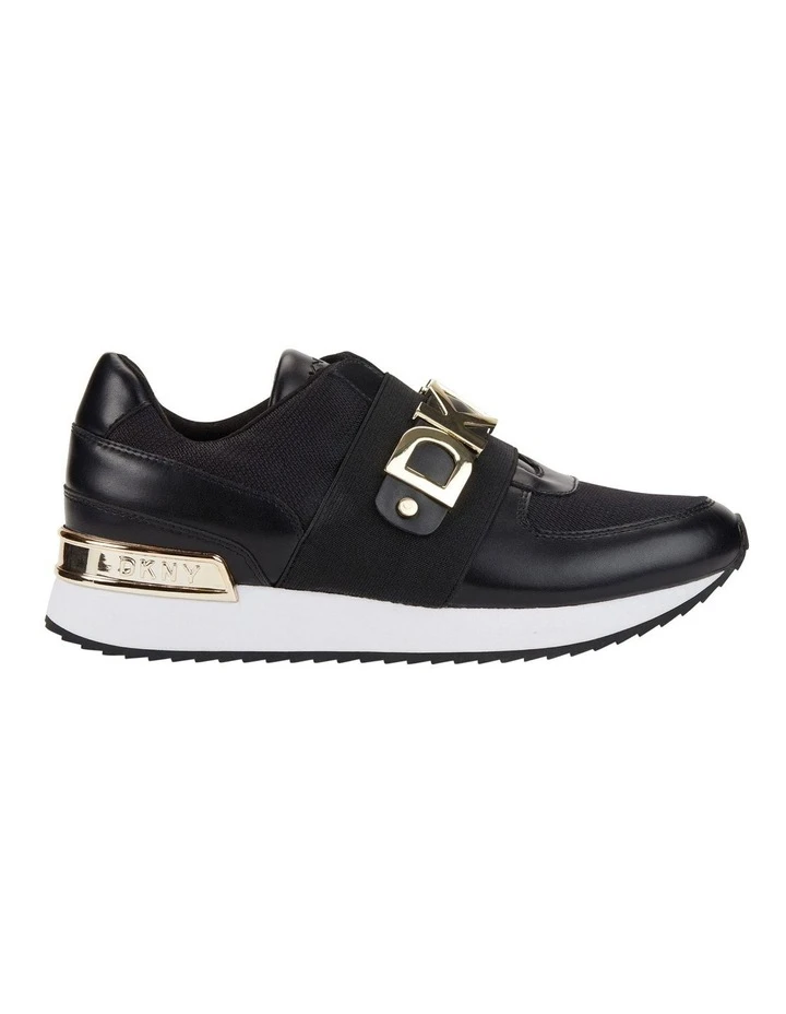 Slip on sneaker with DKNY metal letters on elastic strap on upper vamp, metal rand on back counter, round toe, memory foam footbed.