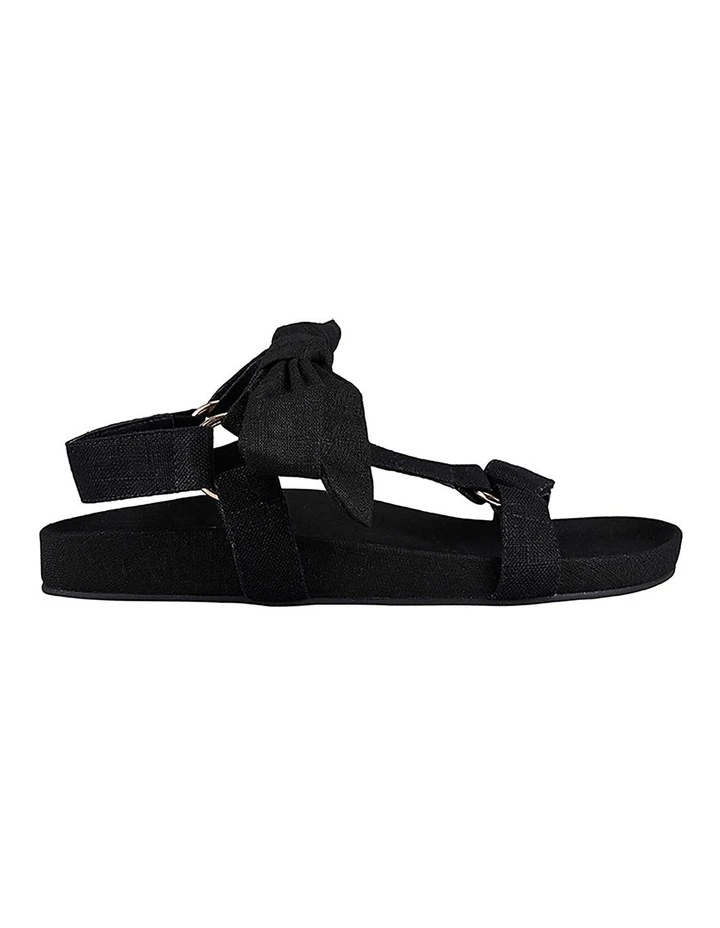 The Calum wedge: a dad sandal, but make it cute. Featuring a deep footbed with black organic linen straps, all wrapped up with a bow on top. Literally.