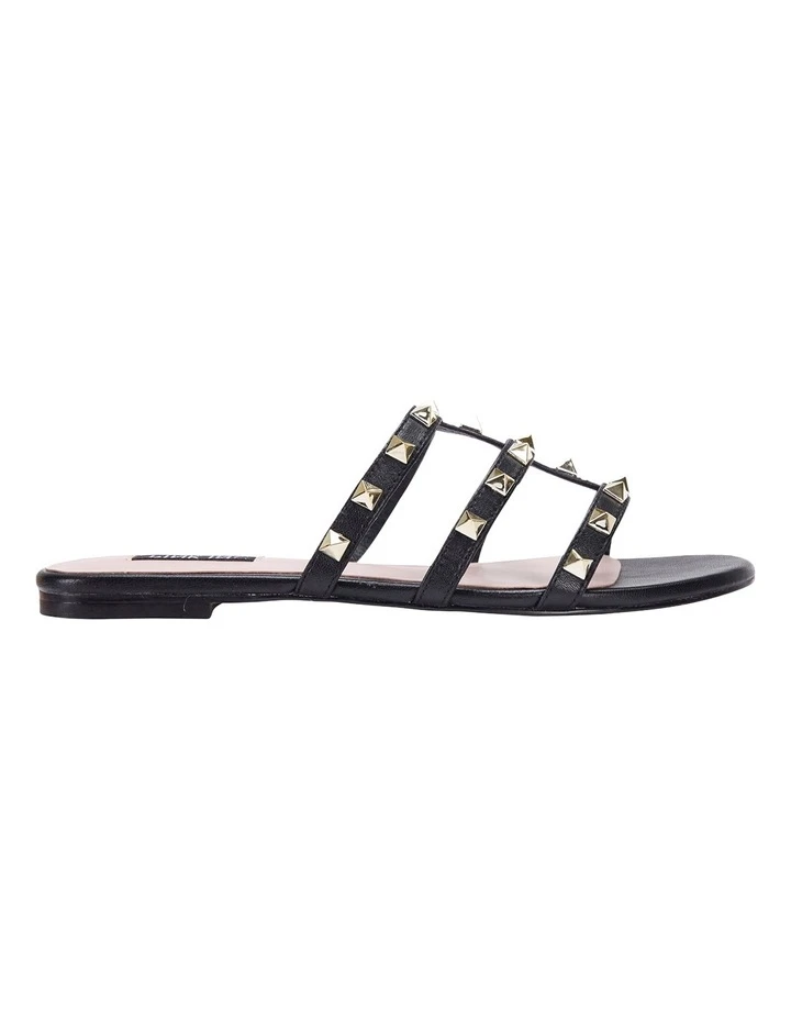 Slide into summer in SPAIN. Adorned with statement pyramid studs and crafted from quality metallics and leathers, this slide is sure to be your newest go-to style no matter the occasion.